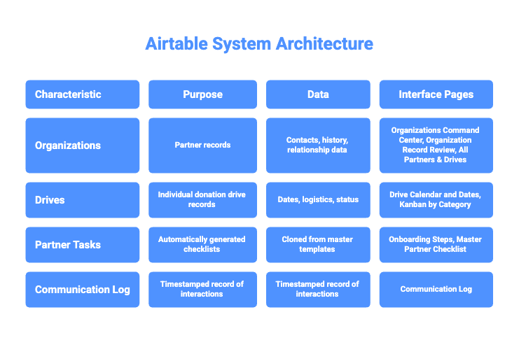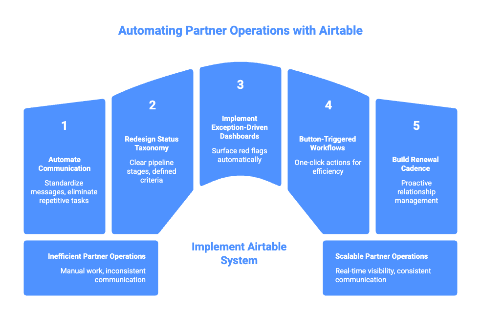 I designed and implemented a complete Airtable operations system that automated partner onboarding, standardized communication workflows, and gave leadership real-time visibility into the entire pipeline.